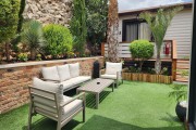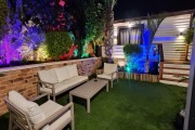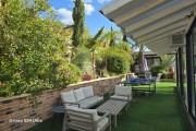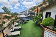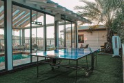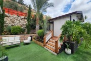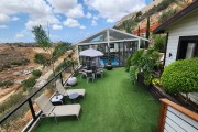 יש מיטת שיזוף בגינה, נדנדה לגינה, דשא במתחם, סוככי שמש, רהיטי גן מפנקים, עצים, שולחן פינג פונג, בגינה תלוי ערסל, פינת ישיבה לנופשים שיש ממנה נוף.