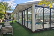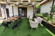 מטבח חיצוני משותף מקורה עם פינת אוכל גדולה ומאובזר ב: פינת קפה, מכונת קפה, קומקום חשמלי, מקרר, מקפיא, בר מים, טוסטר אובן, מיקרוגל, תנור אפייה, סירים, מחבתות, כלי הגשה, כיריים גז.