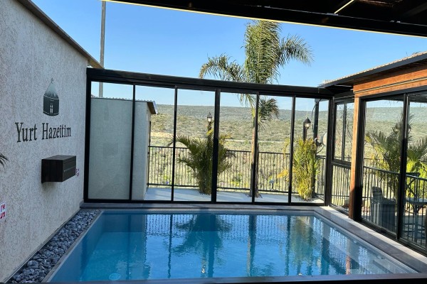 | בריכה מקורה חלומית ומחוממת. הבריכה נמצאת בחלל סגור ובחודשי הקיץ ניתן להפוך אותה לחלל פתוח